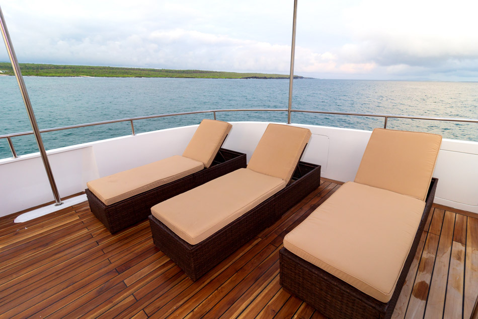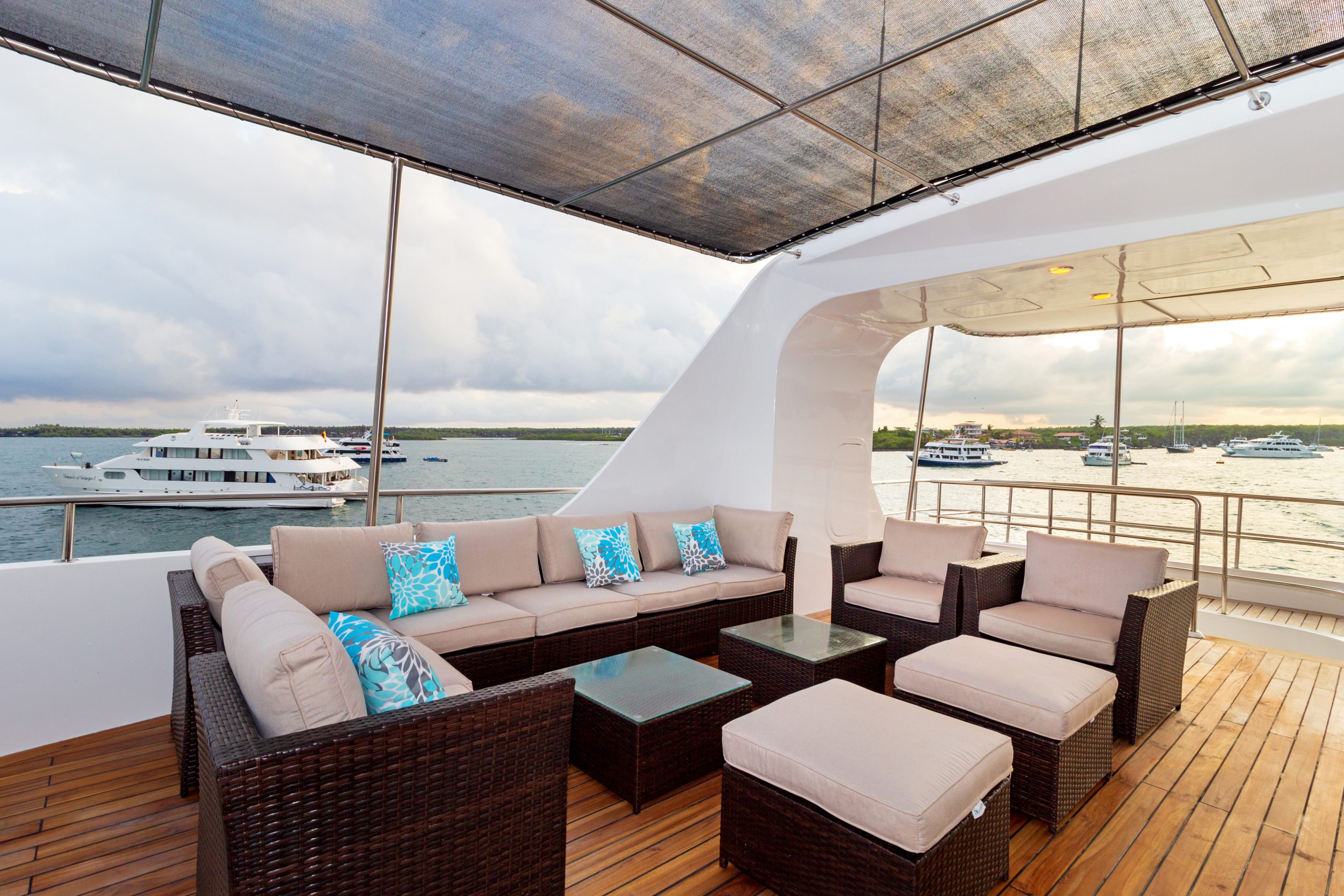The Reina Silvia a first class boa which has features not found on other yachts of its class. On the main deck’s aft is the boarding and swim platform, and the extended bow pulpit is excellent for scouting whales and dolphins. The upper deck features a large, sheltered lounge and bar, with unusual circular seating that assures you a 360-degree view of the Islands while having a drink at sunset and equator crossings.
